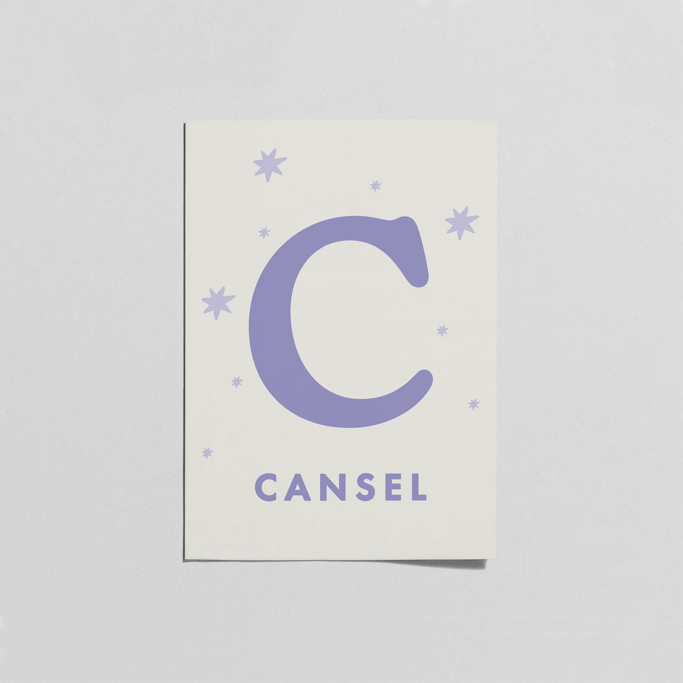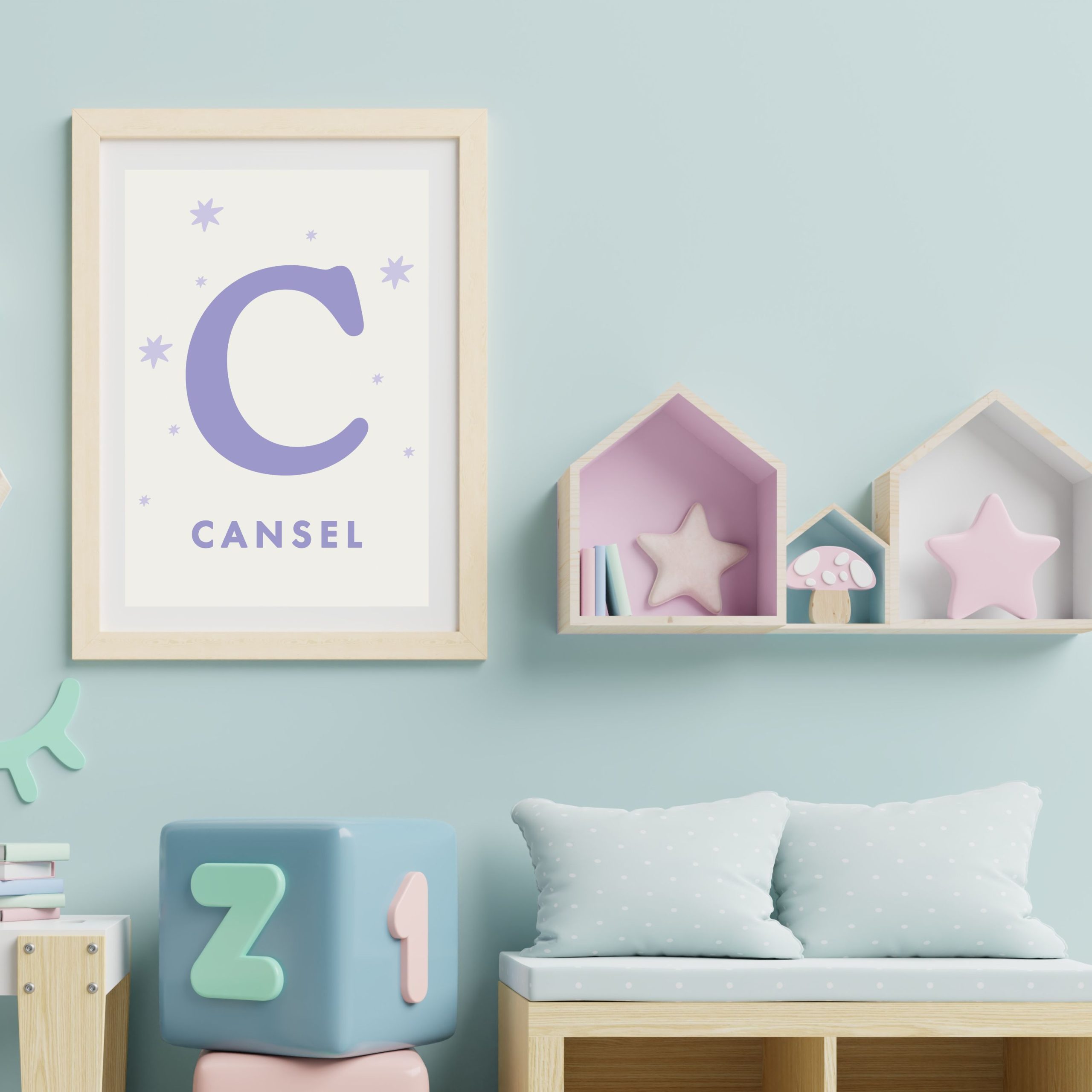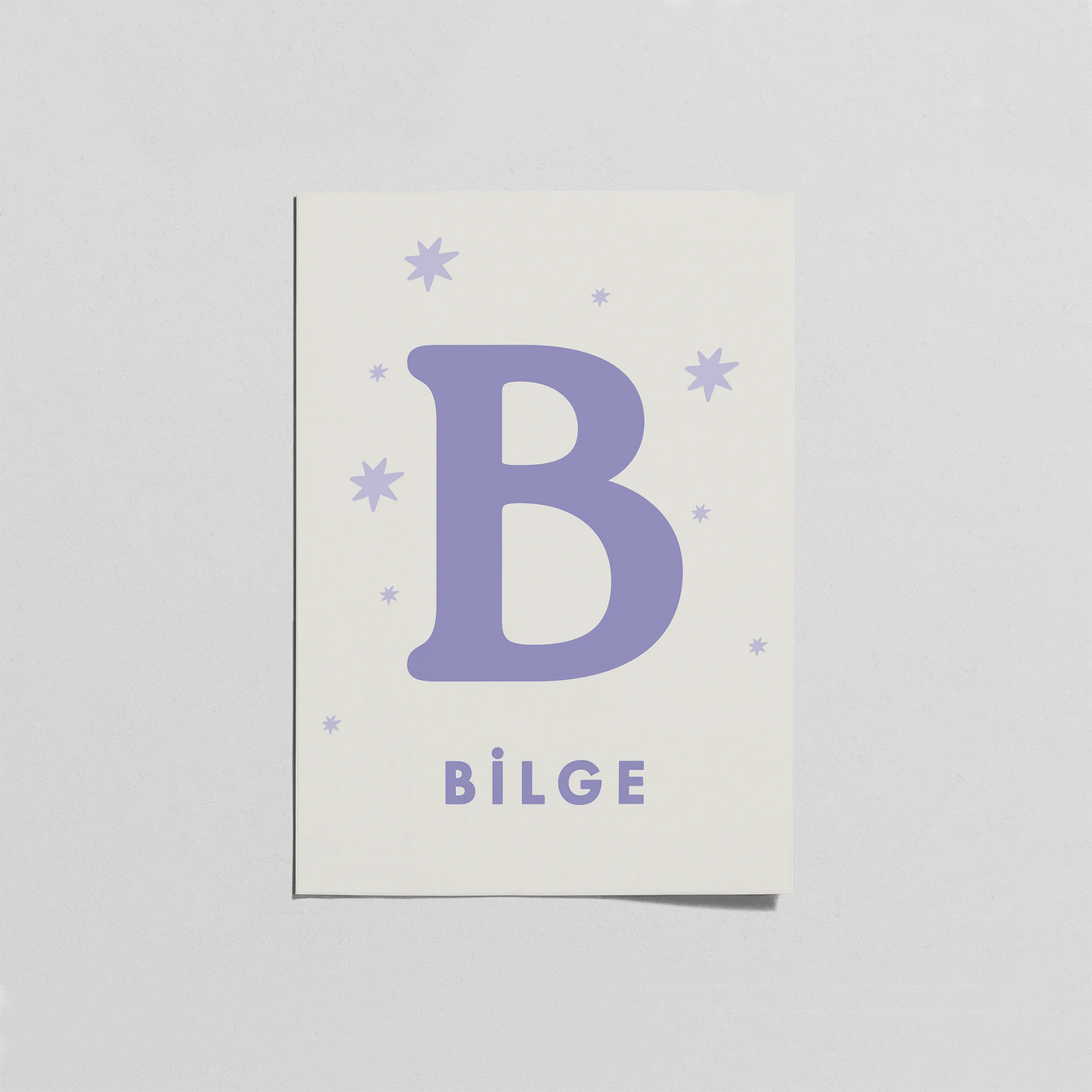 A’dan Z’ye tüm harf seçenekleriyle, bebeğinizin ismine özel tasarlanan lila tonlu minimal harf posteri. Yumuşak yıldız detaylı, masalsı nursery dekoru. Çerçeve fiyata dahil değildir.